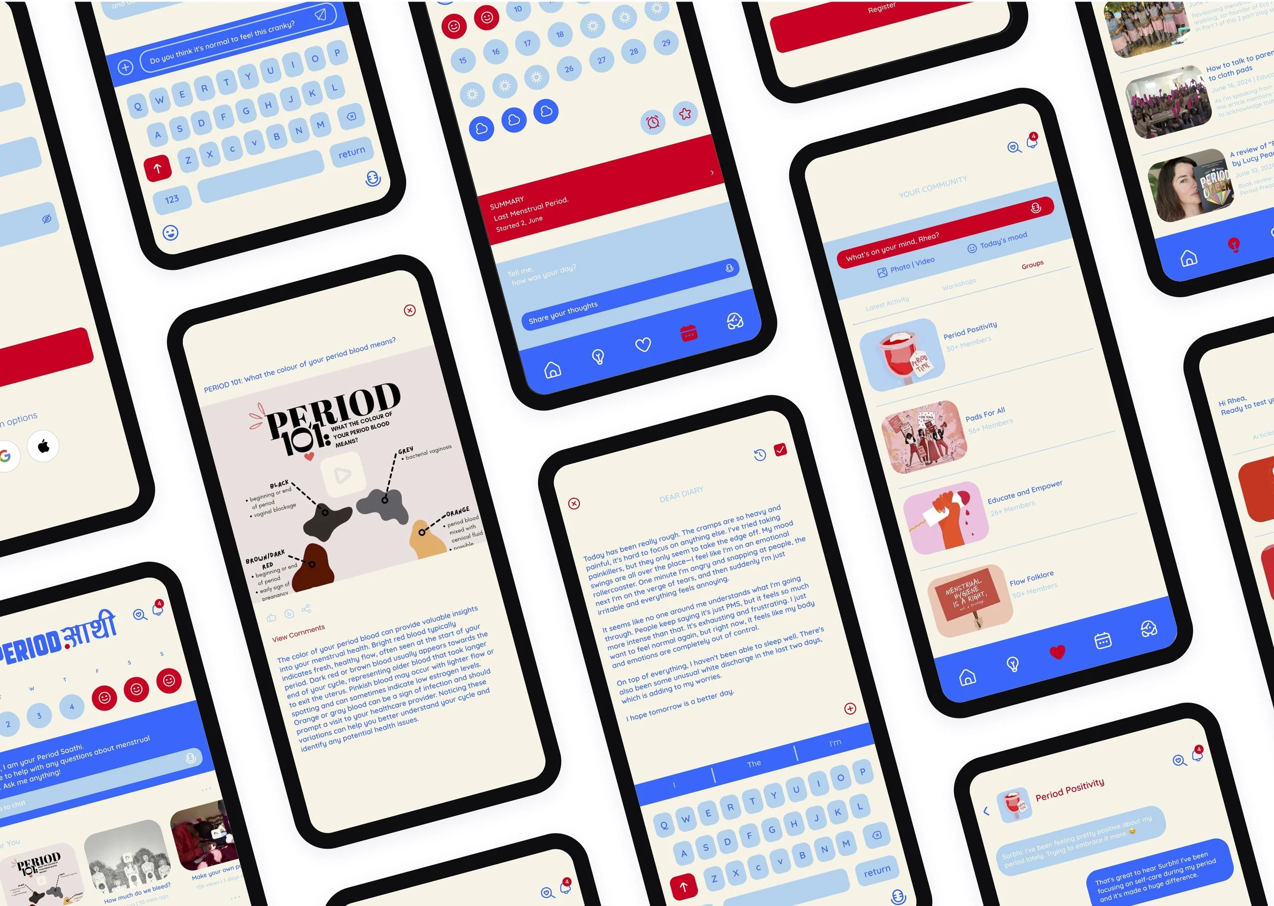 Period Saathi was developed as a concept app that blends technology with culturally resonant visual cues to create a safe and reassuring space for menstrual learning. The process covered research, user interviews, system mapping, wireframing, prototyping, and iterative testing. The final experience centered on calm, sensory-driven interactions that normalise conversations around menstrual health.